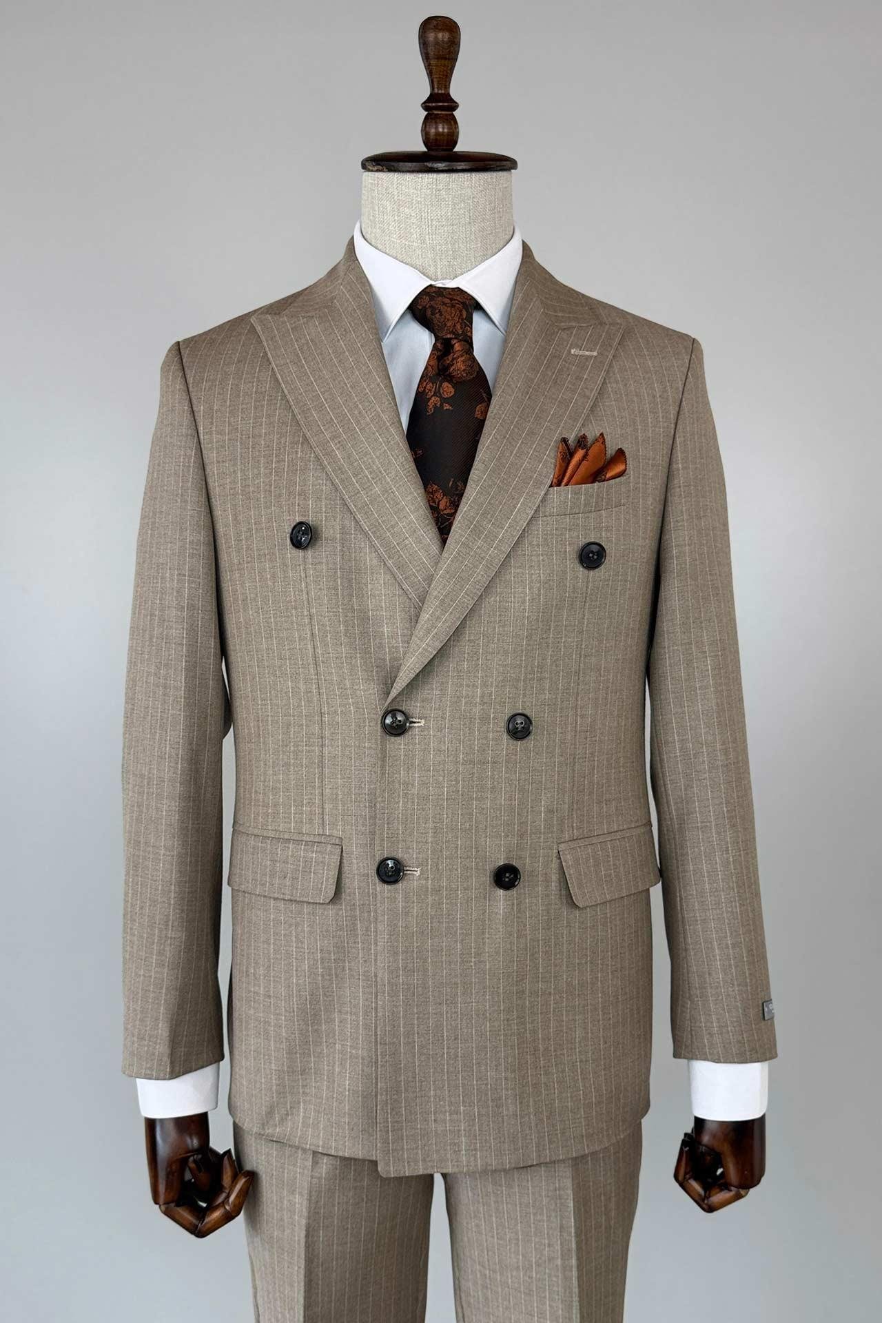 Slim Fit Kruvaze Çizgili Kahverengi Takım Elbise